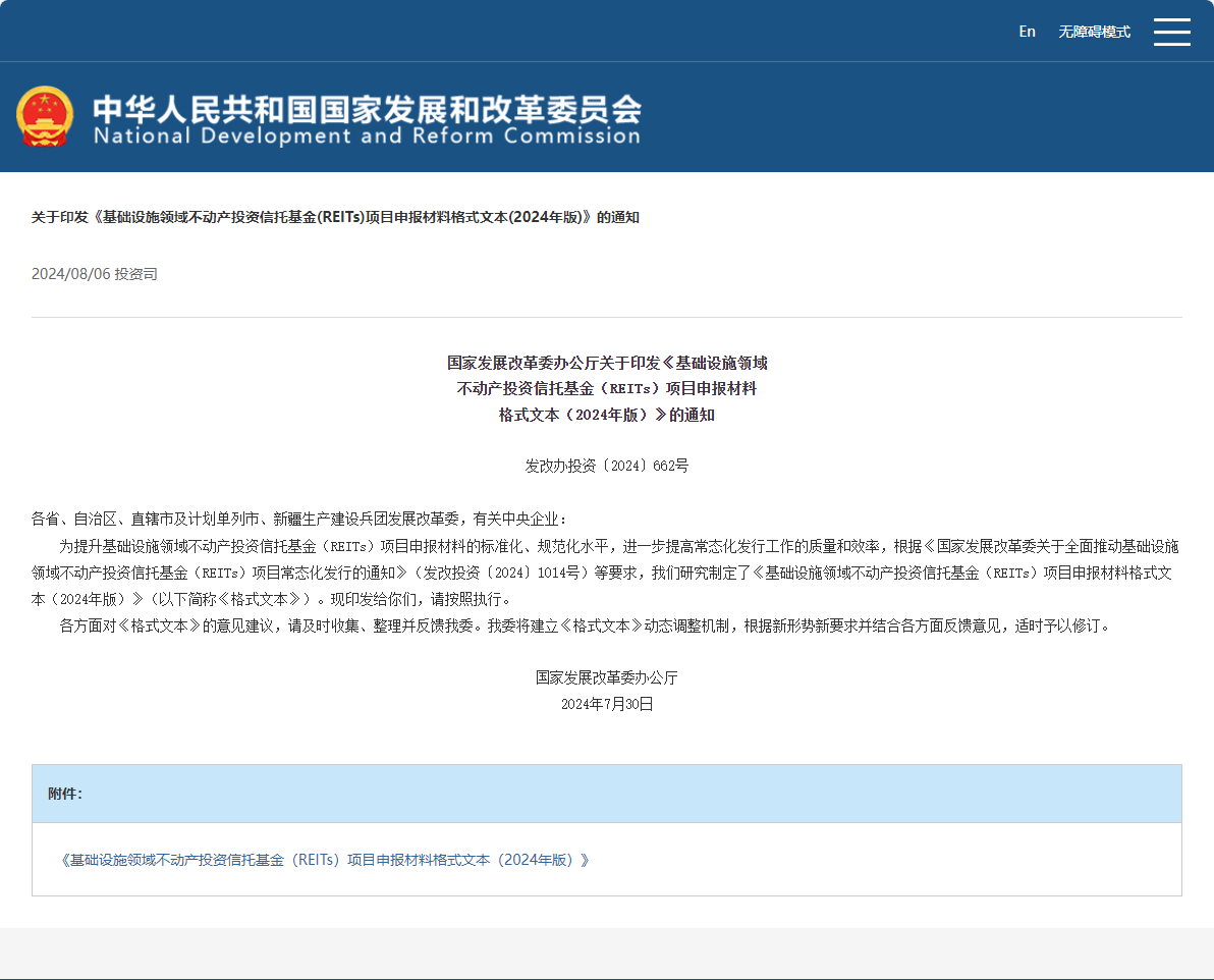 國(guó)家發(fā)展改革委辦公廳關(guān)于印發(fā)《基礎(chǔ)設(shè)施領(lǐng)域不動(dòng)產(chǎn)投資信托基金(REITs)項(xiàng)目申報(bào)材料格式文本(2024年版)》的通知 發(fā)改辦投資〔2024〕662號(hào)各省、自治區(qū)、直轄市及計(jì)劃單列市、新疆生產(chǎn)建設(shè)兵團(tuán)發(fā)展改革委,有關(guān)中央企業(yè):  為提升基礎(chǔ)設(shè)施領(lǐng)域不動(dòng)產(chǎn)投資信托基金(REITs)項(xiàng)目申報(bào)材料的標(biāo)準(zhǔn)化、規(guī)范化水平,進(jìn)一步提高常態(tài)化發(fā)行工作的質(zhì)量和效率,根據(jù)《國(guó)家發(fā)展改革...